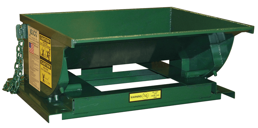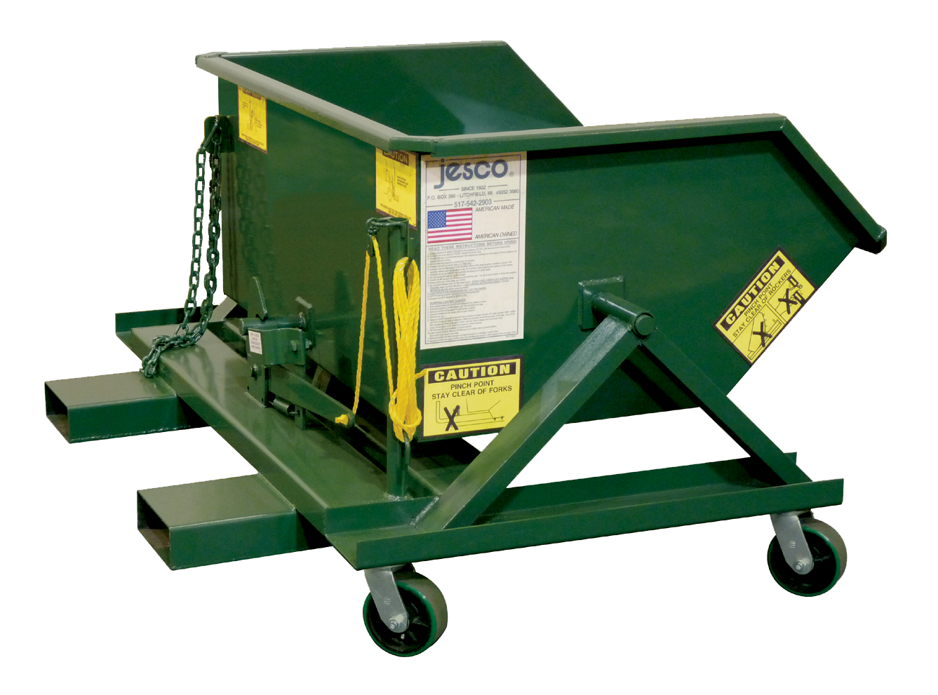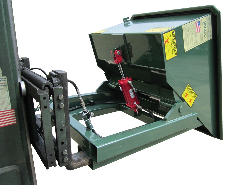 Time tested construction of self dumping hopper offers the JescoHydraTilt® Dumper designed to work off of your forklift hydraulic system where control is important for the material dumping or the speed of discharge is critical. Your safety committee’s dream solution to keep the operator seated on the forklift while discharging contents. Saves time and save money.
