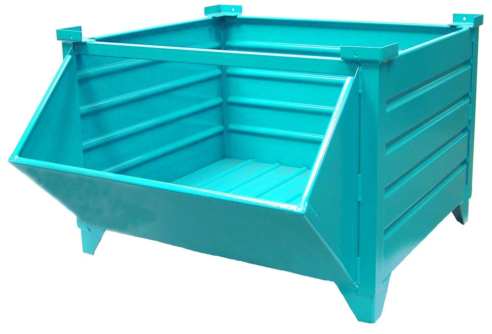 Built from 13 gauge steel, these containers either 18” or 24” inside height provide secure storage and has 7 gauge 2” x 2” x 3/16” structural angle, stacking corners for stacking easily which may be stacked five high fully loaded. The use of deep corrugations to add strength without extra weight. The containers resist common wear and tear. All welded construction. Standard finish is unpainted. Optional paint with selected colors, and other options include runners, card holders, crane lugs, roll-over stirrups or fork pockets.